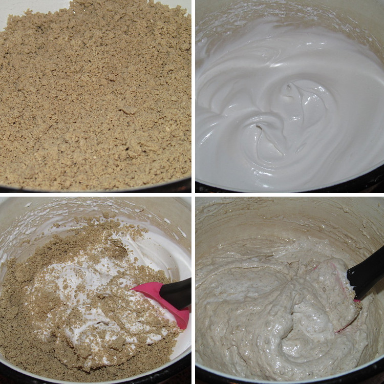 К взбитым белкам добавить халву и аккуратно перемешать.