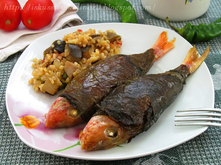Очень вкусная рыбка!!! Эффектная и необычная подача! Виноградные листья придают рыбе особого и неповторимого вкуса, и именно благодаря листьям барабулька готовится как бы в своем соку, что делает ее очень нежной и сочной))) Ну а про пряную начинку из феты думаю и говорить не стоит, и так понятно, что это великолепно! Поэтому я вам очень рекомендую приготовить и попробовать эту рыбку! Кстати, в летний период рыбку можно готовить на мангале, уверенна со вкусом дымка будет еще более вкуснее))) Угощайтесь!!!