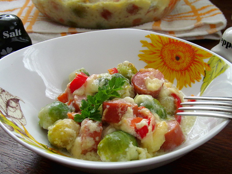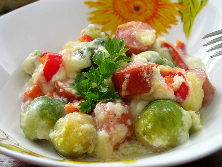 Брюссельская капуста с сосисками запеченная под сливочным соусом