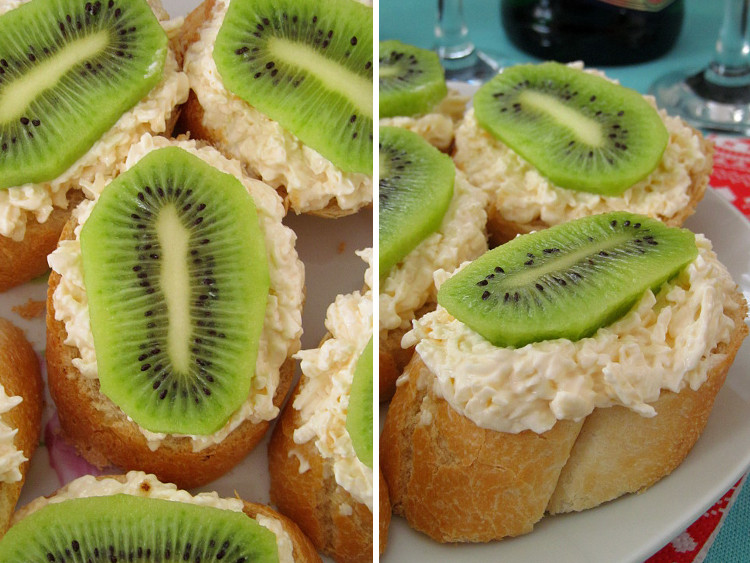 На кусочки багета намазать смесь из плавленного сыра, а сверху положить по кружочку киви.