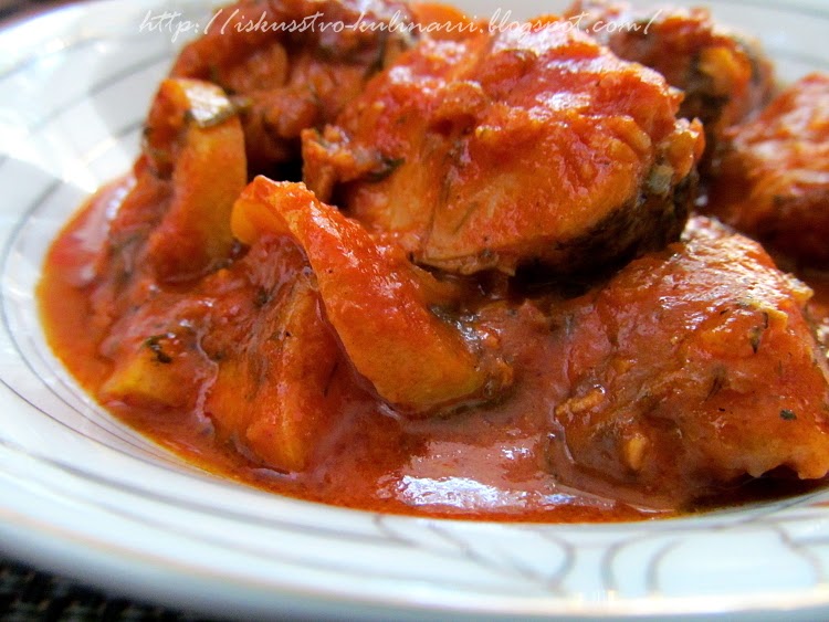 минуты. Затем добавить томатную пасту, обжарить минутку, выложить рыбу и подсолить. Я подлила немного воды, дабы образовалась подливка, хотя в оригинальном рецепте гуляш тушится без воды)))