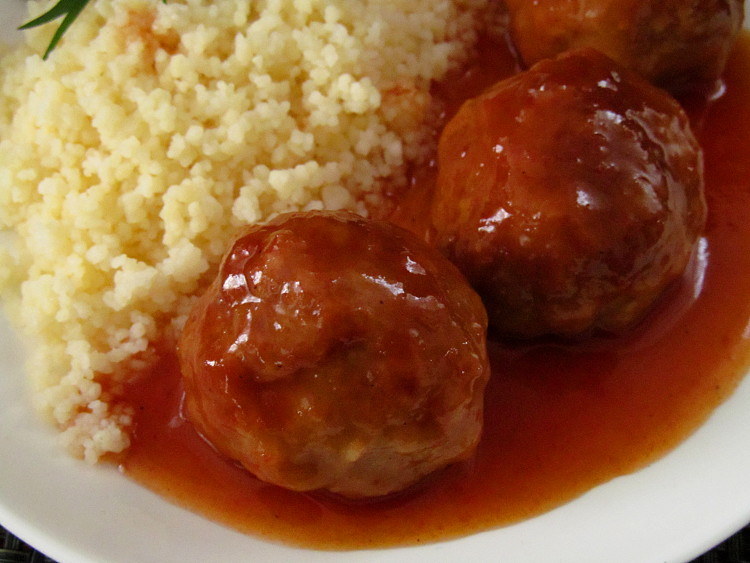Подавать фрикадельки теплыми с рисом на гарнир (у меня кус-кус), поливая соусом.