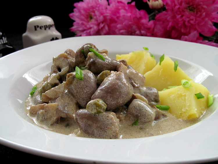 Фрикасе — это простое но очень вкусное блюдо французской кухни. Фрикасе представляет собой рагу преимущественно из белого мяса в белом соусе. Чаще всего для этого блюда используют мясо телятины, кролика или курицы, но в современном мире встречаются варианты и со свининой, бараниной, рыбой и морепродуктами, ну и с субпродуктами — в моем случае с куриными сердечками))) Получается очень вкусное блюдо с совершенно нетривиальным вкусом! К грибам и каперсам так же можно добавить зеленый горошек и/или спаржу))) Вместо сметаны можно использовать сливки. Попробуйте!!! Буду очень рада, если рецептик пригодится, и блюдо конечно же понравится!!!