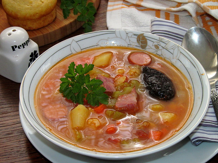 Колбаски нарезать кружочками, бекон небольшими кусочками и слегка обжарить на сковороде, в небольшом количестве масла. После чего добавить в суп вместе с лавровым листом.