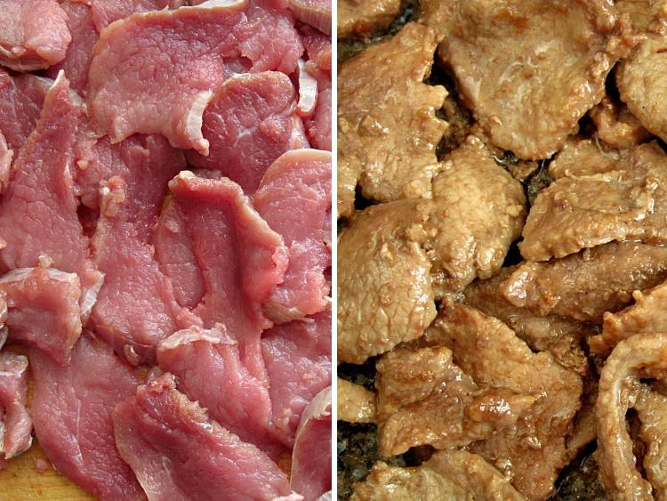 Мясо нарезать небольшими тонкими ломтиками.