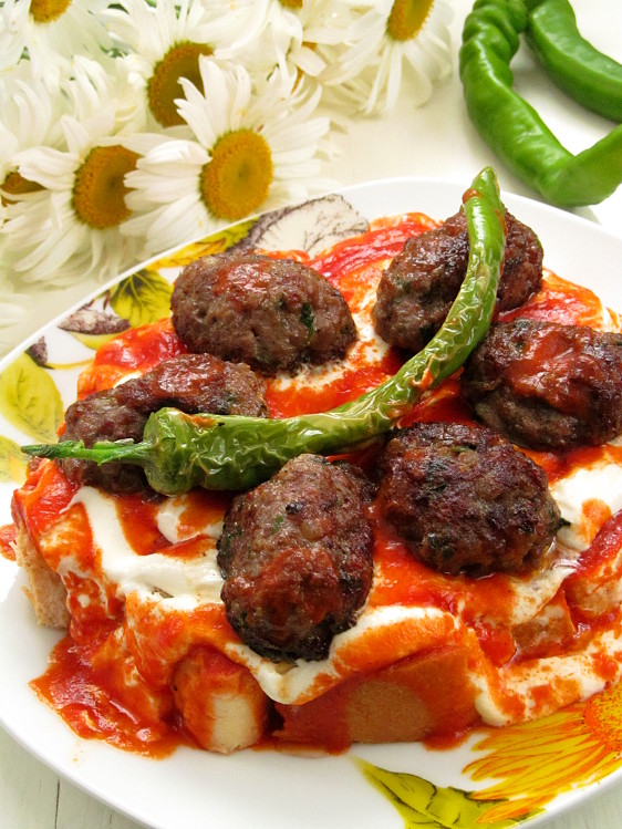 На тарелки выложить кусочки хлеба, сверху полить йогуртом, затем выложить кёфты и полить томатным соусом.