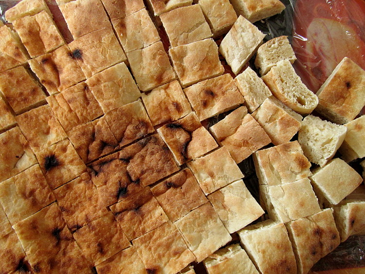 Хлеб нарезать на небольшие кусочки и немного поджарить на сухой сковороде.