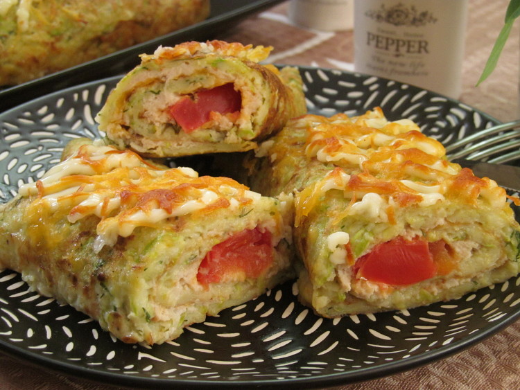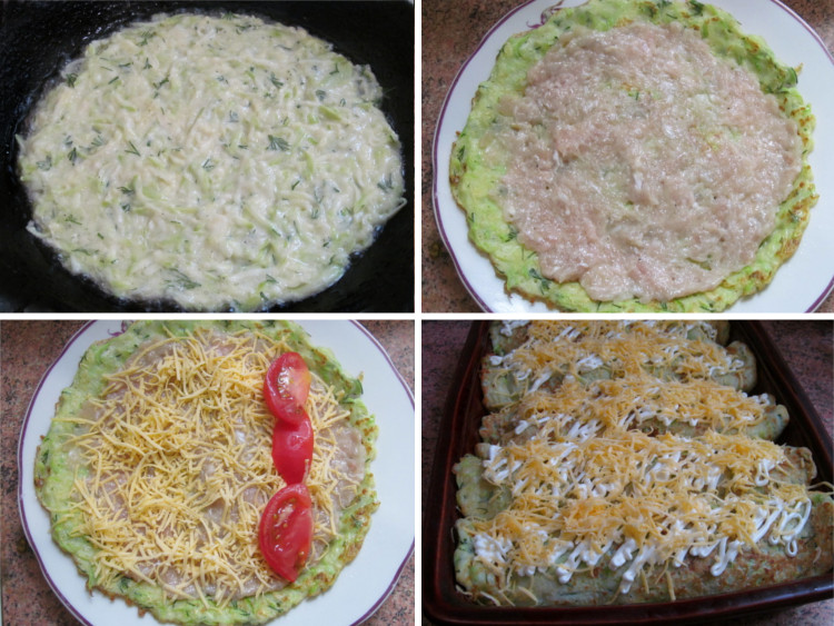 На готовый кабачковый блин выложить пару ложек куриного фарша и распределить по всей поверхности. Сверху посыпать тертым сыром, на одну сторону выложить дольки помидор и свернуть плотно рулетом.