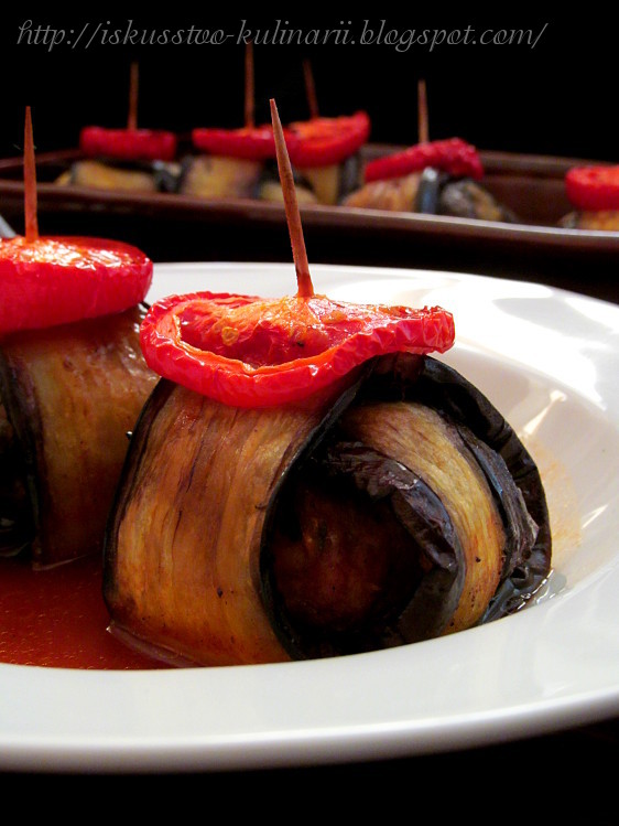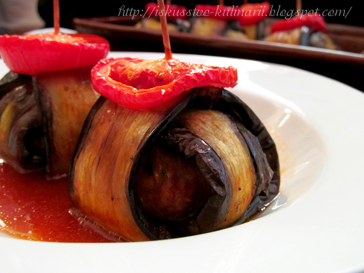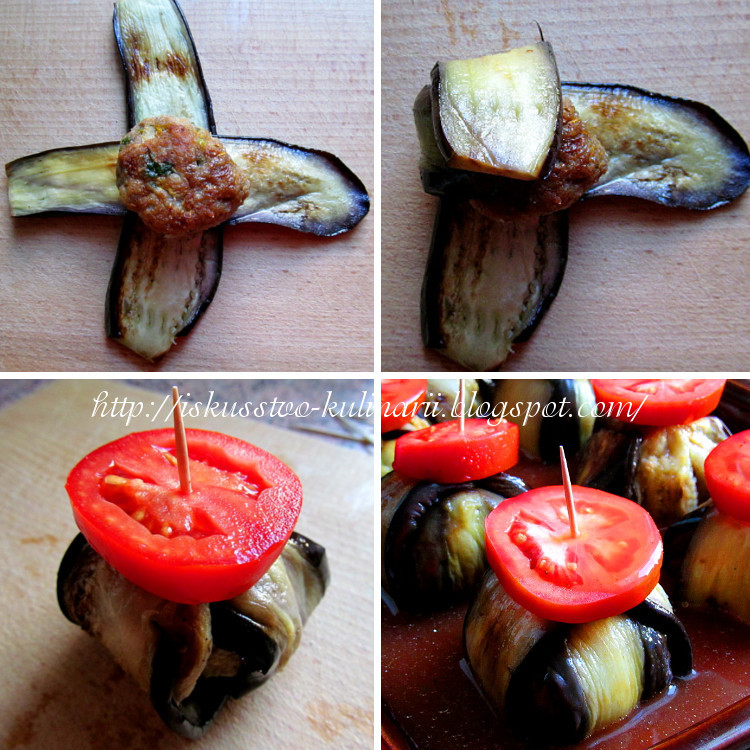 P.S.: котлетки можно предварительно и не обжаривать, а просто положить шарик из фарша на баклажаны и завернуть. После чего уложить кебабы в форму для запекания, влить пол стакана воды и отправить в духовку на 10 минут. Затем томатную пасту развести водой, посолить, поперчить и залить кебабы. Готовить еще 10-15 минут.