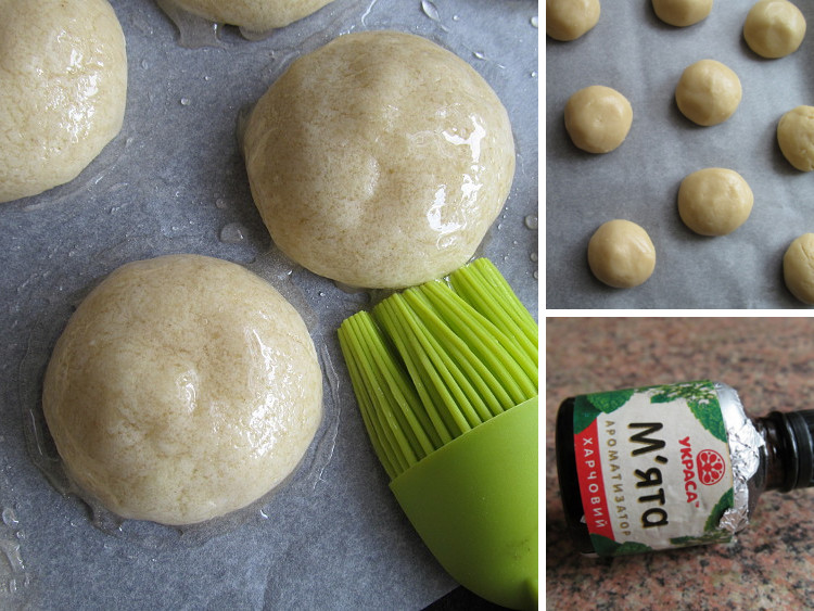 В миске смешать муку с содой, добавить растительное масло и влить остывшую сахарно-мятную смесь. Вымешать мягкое тесто.