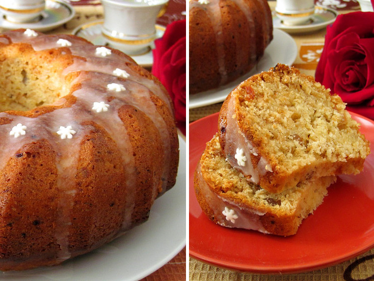 Готовый кекс остудить, полить глазурью из сахарной пудры и лимонного сока (все на глаз, до желаемой густоты). По желанию украсить кондитерской посыпкой.