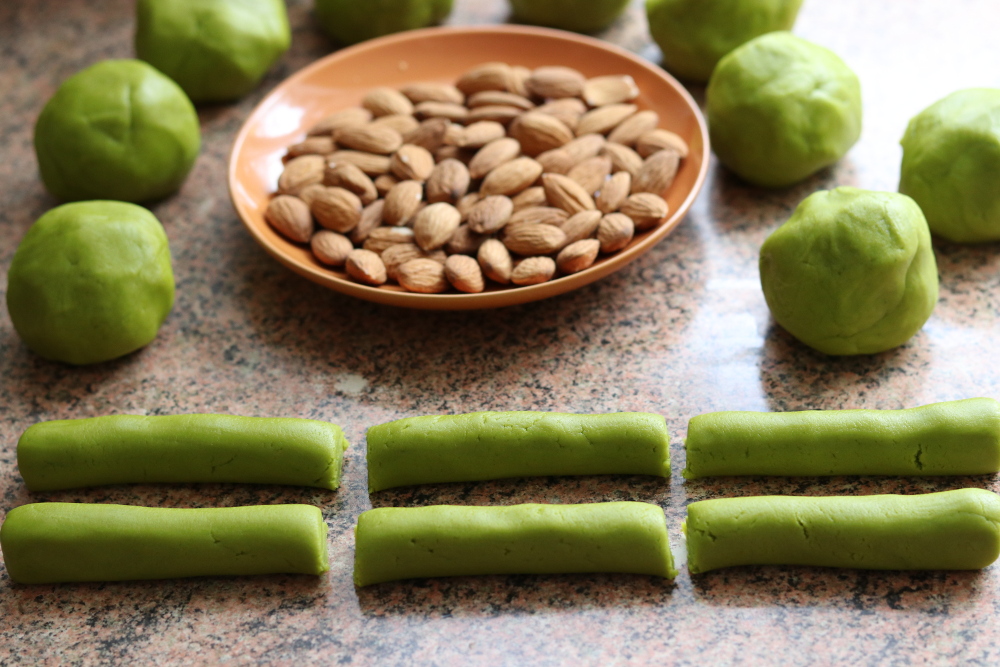 Далее, в каждую заготовку с оной стороны вдавить миндальный орешек. Затем придать заготовкам вид пальцев — сделать выемки и насечки тупым концом ножа, округлить края.