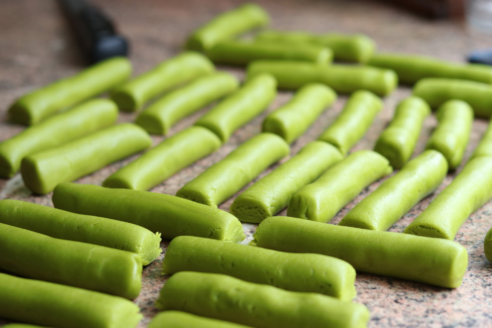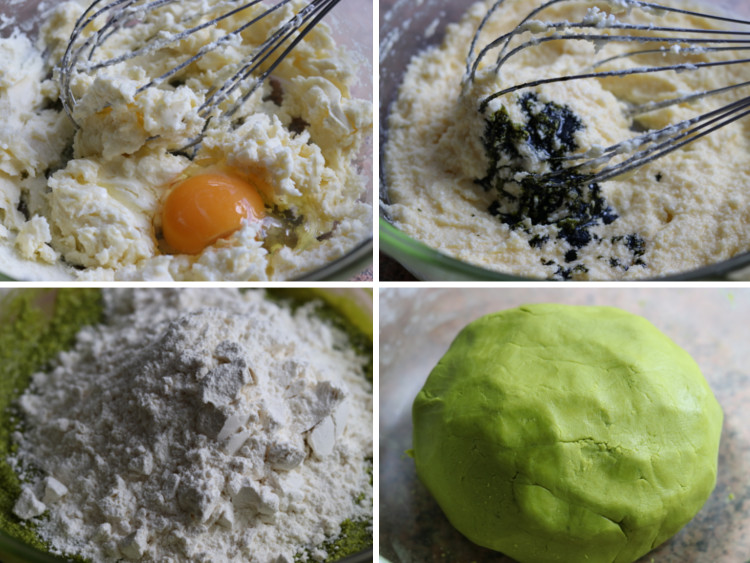Размягченное сливочное масло взбить с сахарной пудрой, ванильным сахаром и щепоткой соли. Добавить яйцо и еще раз взбить. Затем добавить зеленый пищевой краситель и цедру лимона (если используете), перемешать. Следом всыпать муку с разрыхлителем и замесить тесто. Тесто должно получится вмеру мягкое и не липнущее к рукам.