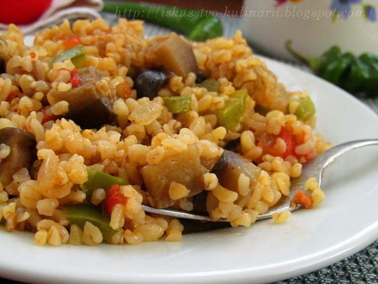 Вкуснейший турецкий пилав из булгура с баклажанами!!! Сочный, ароматный и совсем не хлопотный в приготовлении))) Такой замечательный гарнир будет отличным дополнением как к мясу, так и к рыбке. Попробуйте, и я уверенна, что пилав из булгура станет замечательной заменой надоевшему плову из риса!