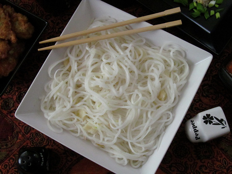 Дайкон очистить и натереть длинноватой «лапшой», либо порезать узкой соломкой. (Я натираю с помощью овощечистки, можно специальной теркой). Потом посолить, перемешать и бросить на 30 минут. Опосля что, слегка отжать от выделившегося сока.