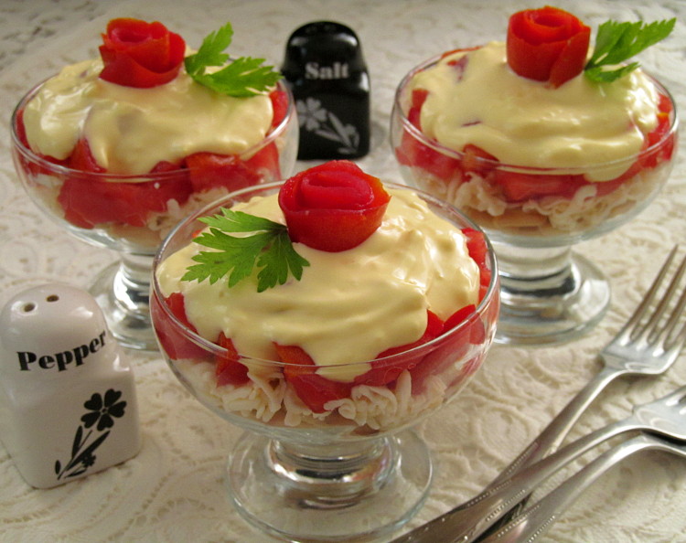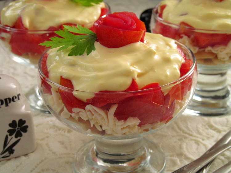 3 слой — помидоры нарезанные кубиком (семена и жидкость удалить);