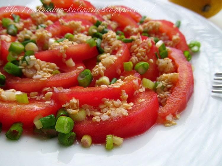 Очень простой в приготовлении, но от того не менее вкусный и интересный салатик!!! Или скорее даже салат-закуска))) Помидорки весьма гармонично сочетаются с кунжутно-чесночной заправкой с добавлением лимона и тмина, делая салатик ароматным и по восточному пряным!!! Замечательная идея как для праздничного стола, так и для будничного. Угощайтесь!!!