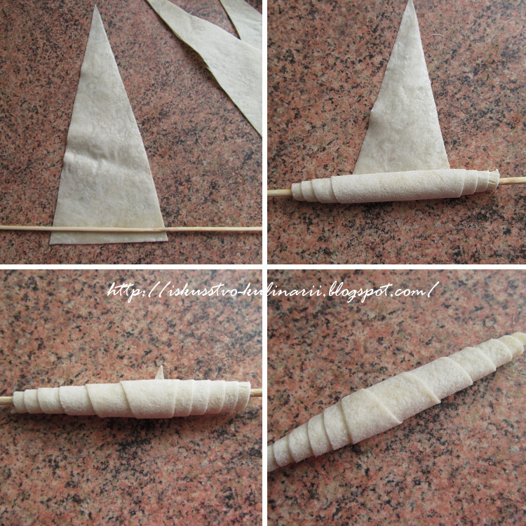 Юфку нарезать треугольниками, края немного смазать водой и с помощью деревянной шпажки скрутить трубочкой (как рогалик).