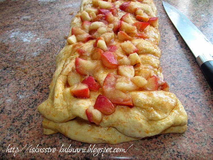 Сверху равномерно распределить яблочную начинку, и разрезать прямоугольник на 6 полос. (Я разрезала на 3 полосы, так как у меня не было подходящей узкой кексовой формы).
