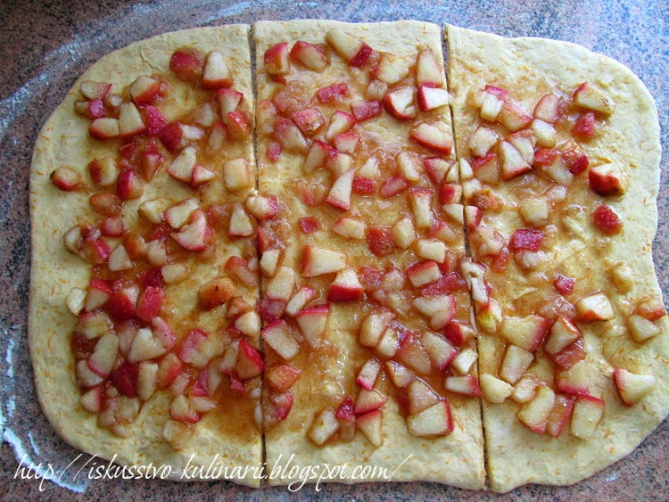 Сверху равномерно распределить яблочную начинку, и разрезать прямоугольник на 6 полос. (Я разрезала на 3 полосы, так как у меня не было подходящей узкой кексовой формы).