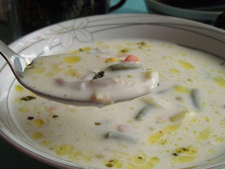 Варить до полуготовности картофеля, после чего добавить стручковую фасоль, нарезанную кусочками примерно 2-3 см длиной, и куриное мясо.