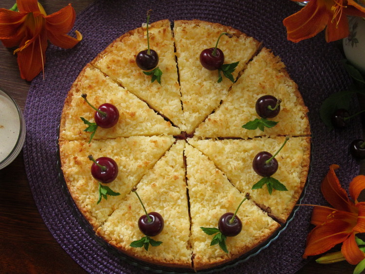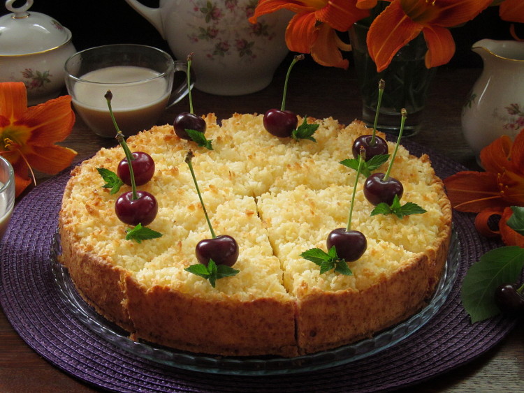 Вот такой вот красивейший пирожок получился путем моей импровизации:) И получился, хочу я вам сказать он очень вкусный!!! А как иначе?! Рассыпчатое песочное тесто, ароматная вишневая прослойка, нежная творожная начинка и похрустывающий кокосовый штрейзель — по моему все просто идеально! Результат превзошел все мои ожидания! Пирог реально получился прям «пальчики оближешь»))) Готовить можно как со свежей, так и с замороженной вишней, или же вовсе можно заменить ее любой другой ягодой по вкусу. А процесс приготовления довольно легкий, справится даже новичок. Одним словом, рекомендую приготовить и вам!!! Угощайтесь!!!