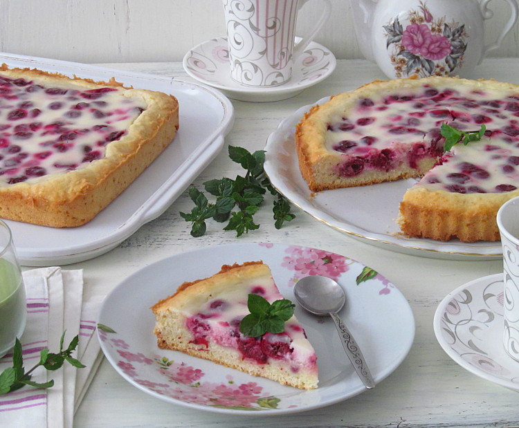 На тесто выложить вишню и умеренно залить сметанной заливкой.