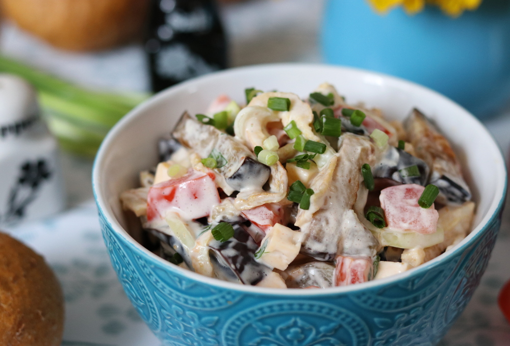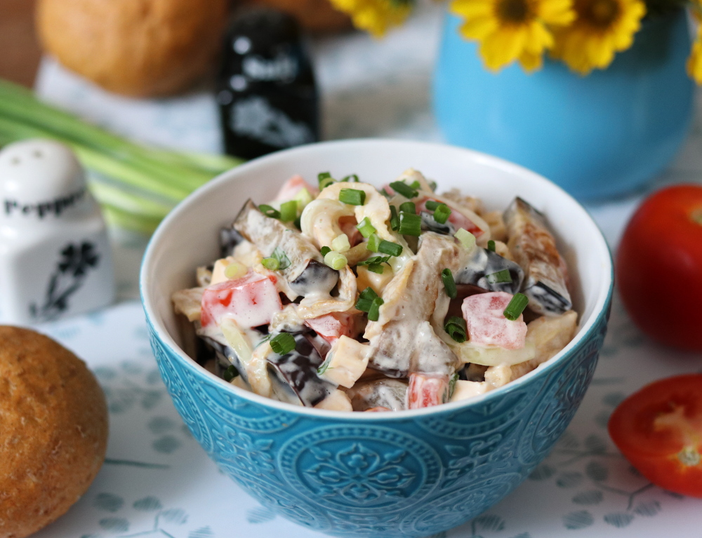 Салатик без преувеличений очень вкусный, немного пикантный и достаточно сытный. Когда готовила его впервые, то не была уверенна, что будет вкусно, ведь состав весьма простой, но я ошиблась — салатик полюбился с первого раза и стал одним из любимых в нашем доме. Подавать его можно как на обед, так и на ужин. Я обычно его подаю к мясу без гарнира, либо просто с булочками, тостами, сэндвичем и т.д. Особенно он понравится любителям баклажан. Рекомендую приготовить и попробовать!
