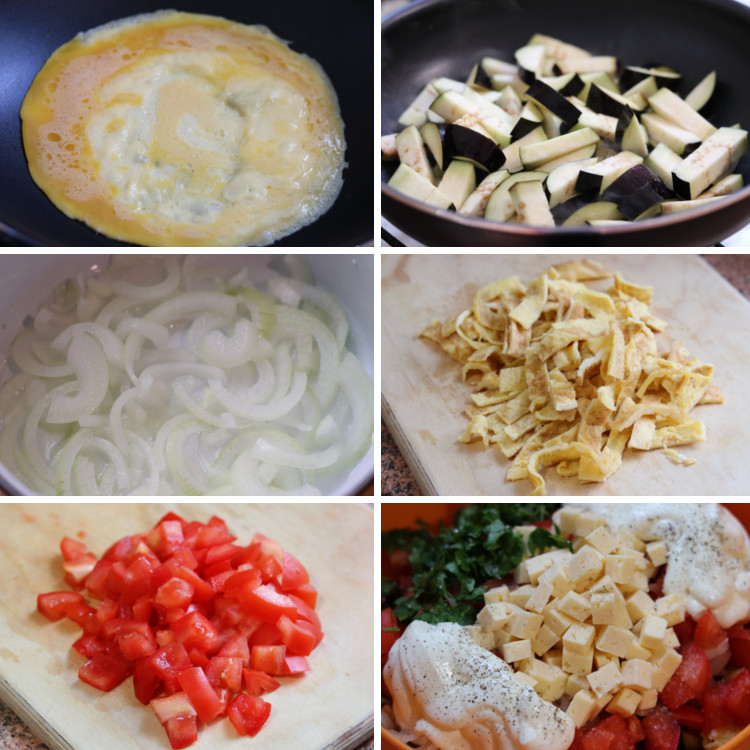 В салатник выложить баклажаны, нарезанные яичные блинчики, помидор, лук, сыр и зеленень. Заправить салат майонезом по вкусу, посолить и поперчить. Перемешать.