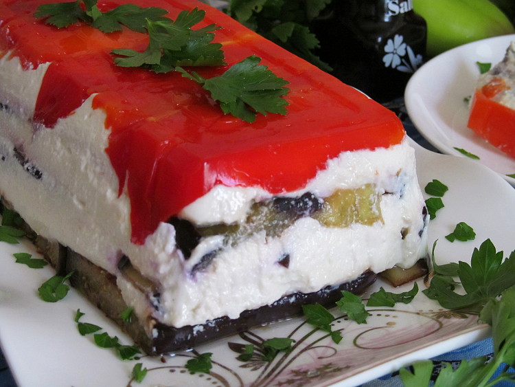 На дно формы выложить печеный перец, что бы не было просветов и смазать творожной массой. Сверху уложить слой баклажан, смазать творожной массой. Далее снова слой баклажан, смазать творожной массой, и последний слой баклажан.